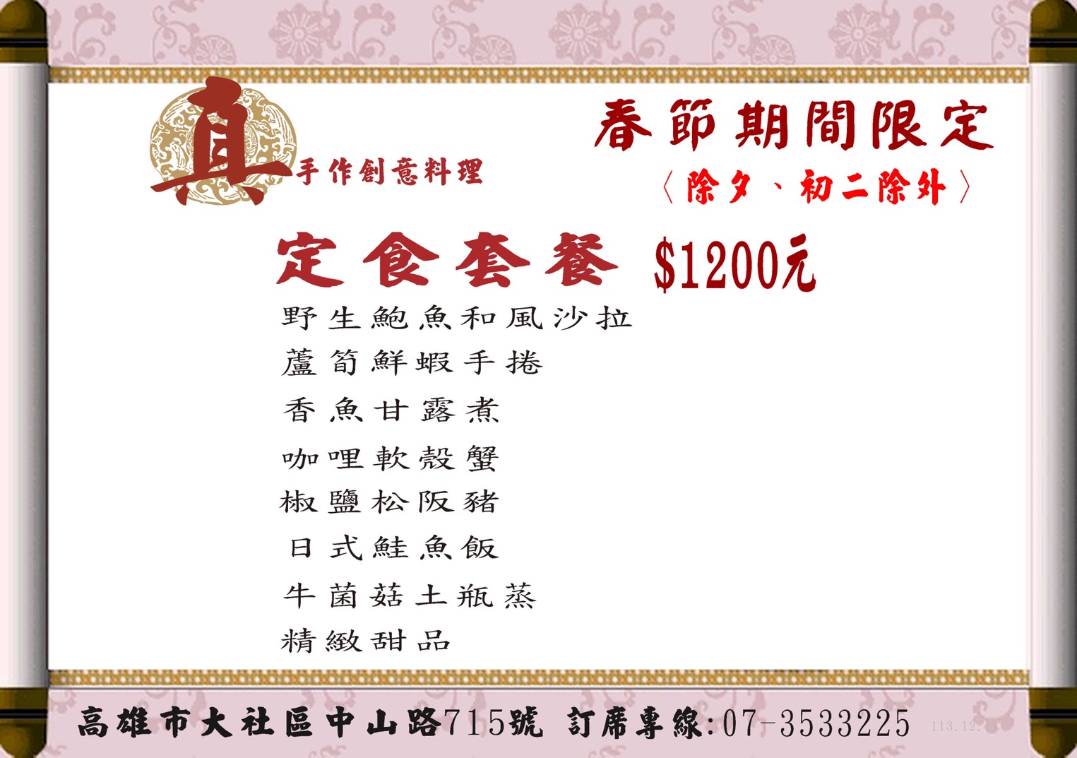 真手作春節期間定食套餐(除夕初二除外)